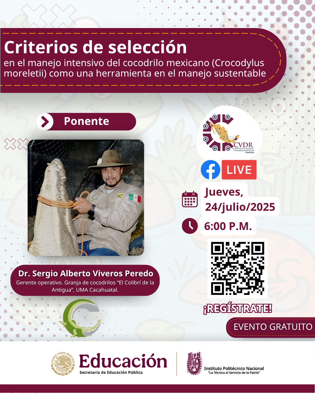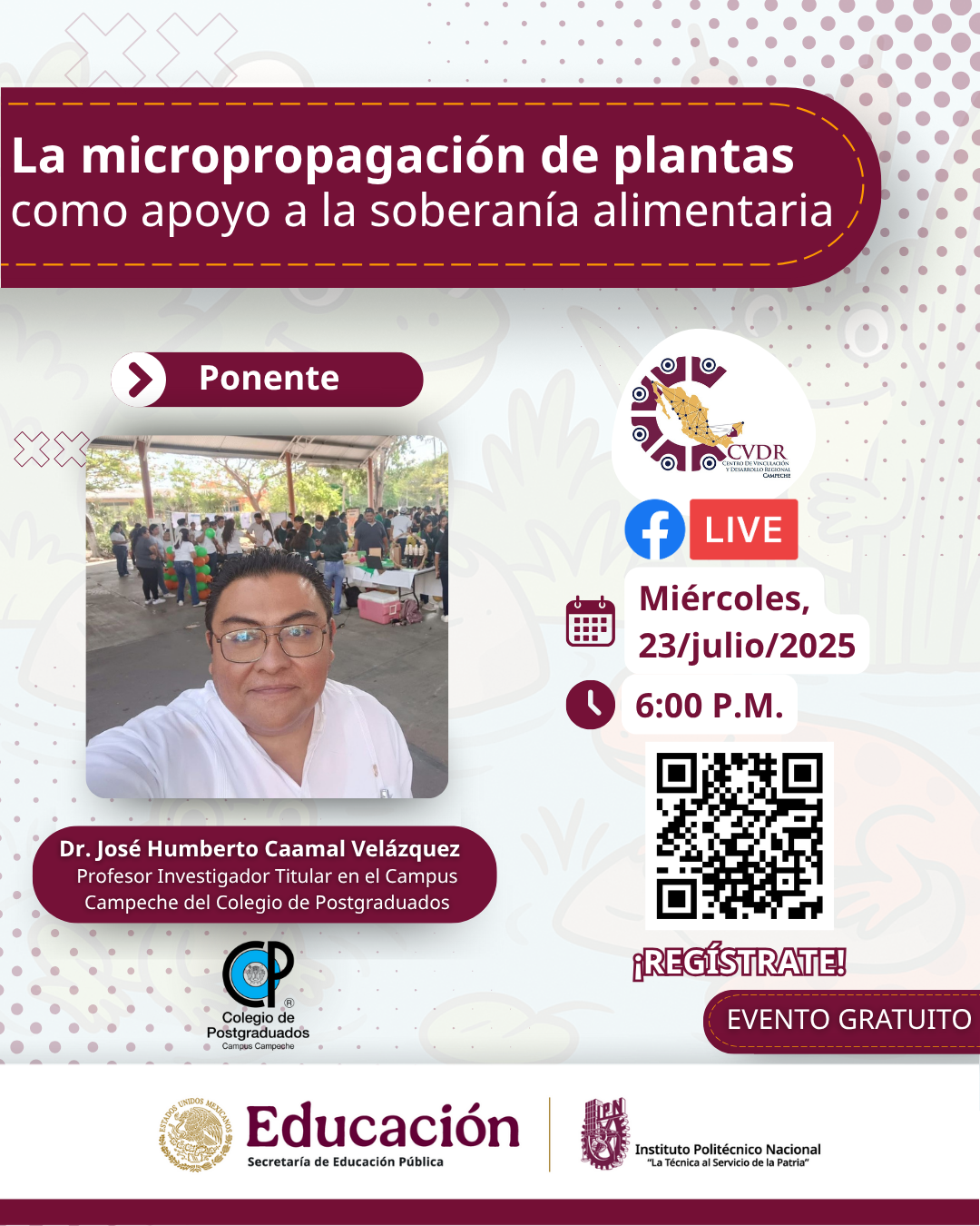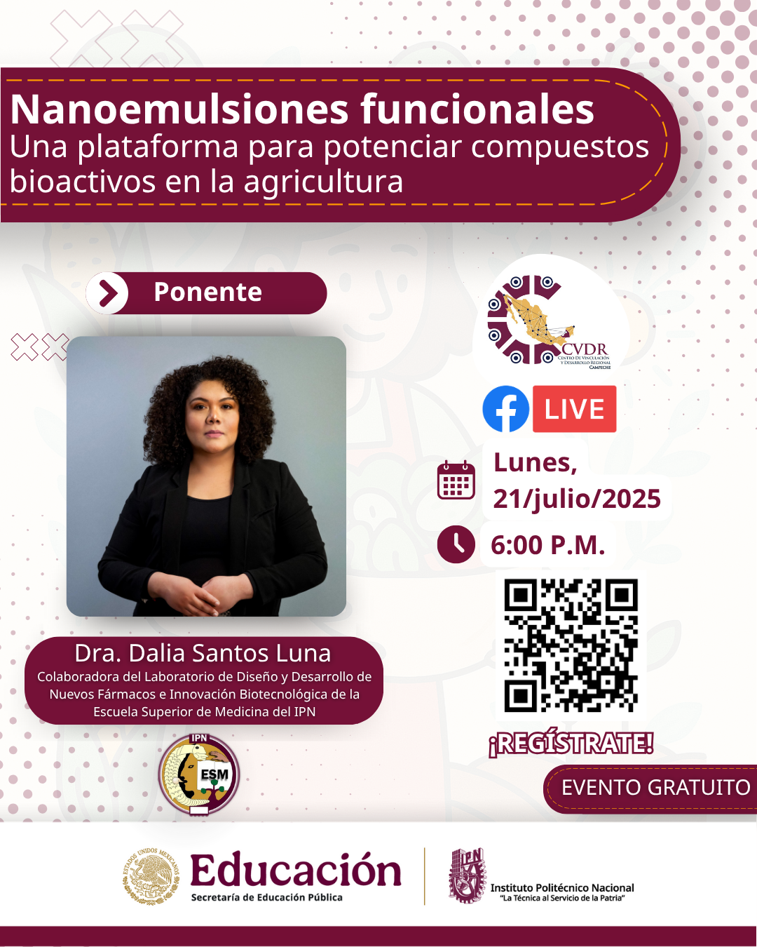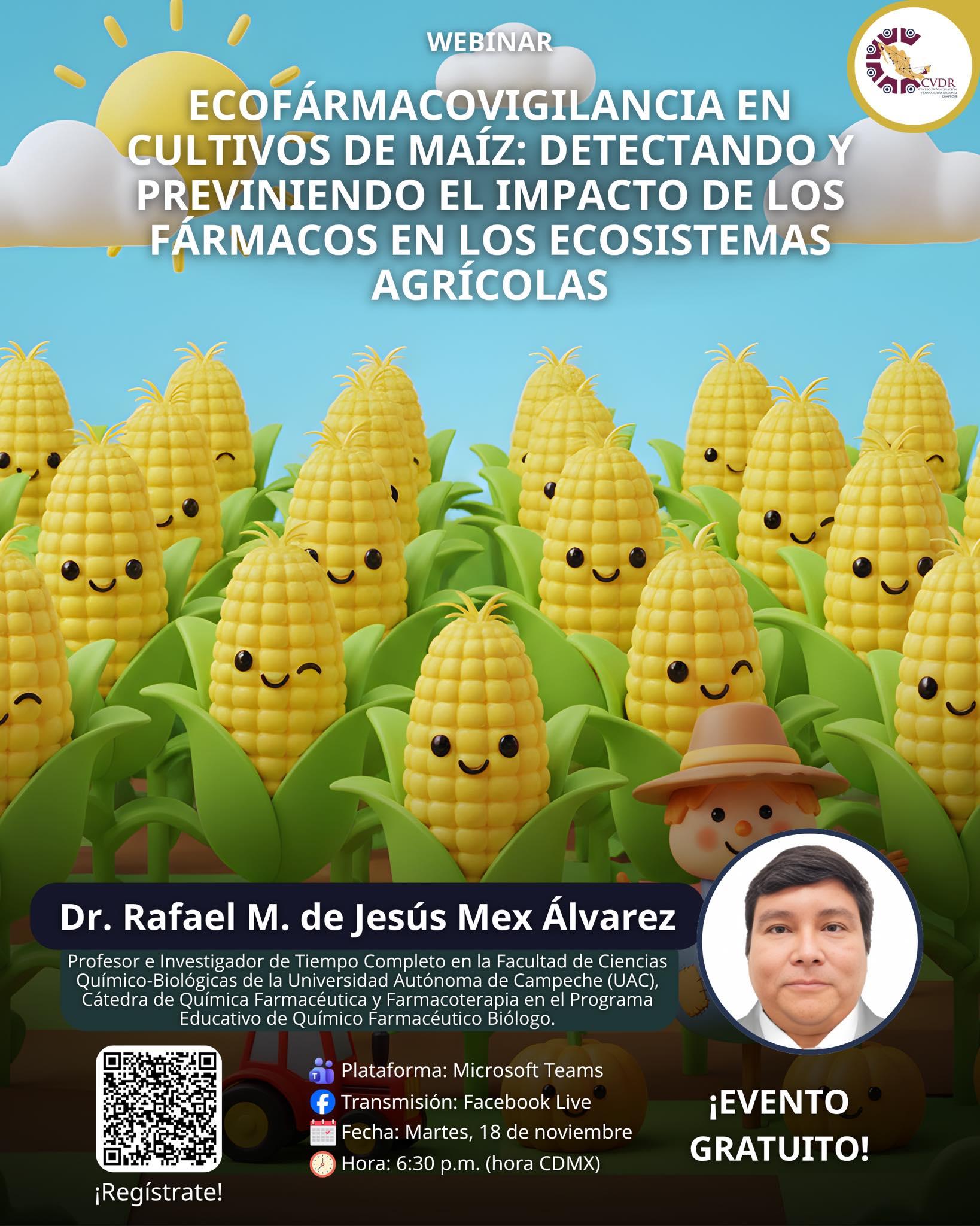 El CVDR Campeche del IPN, los invita a participar en la videoconferencia "Ecofármacovigilancia en Cultivos de Maíz: Detectando y Previniendo el Impacto de los Fármacos en los Ecosistemas Agrícolas", dirigida a toda la comunidad en general, así como interesados en fortalecer sus conocimientos en materia de ciencias agropecuarias y desarrollo sustentable.