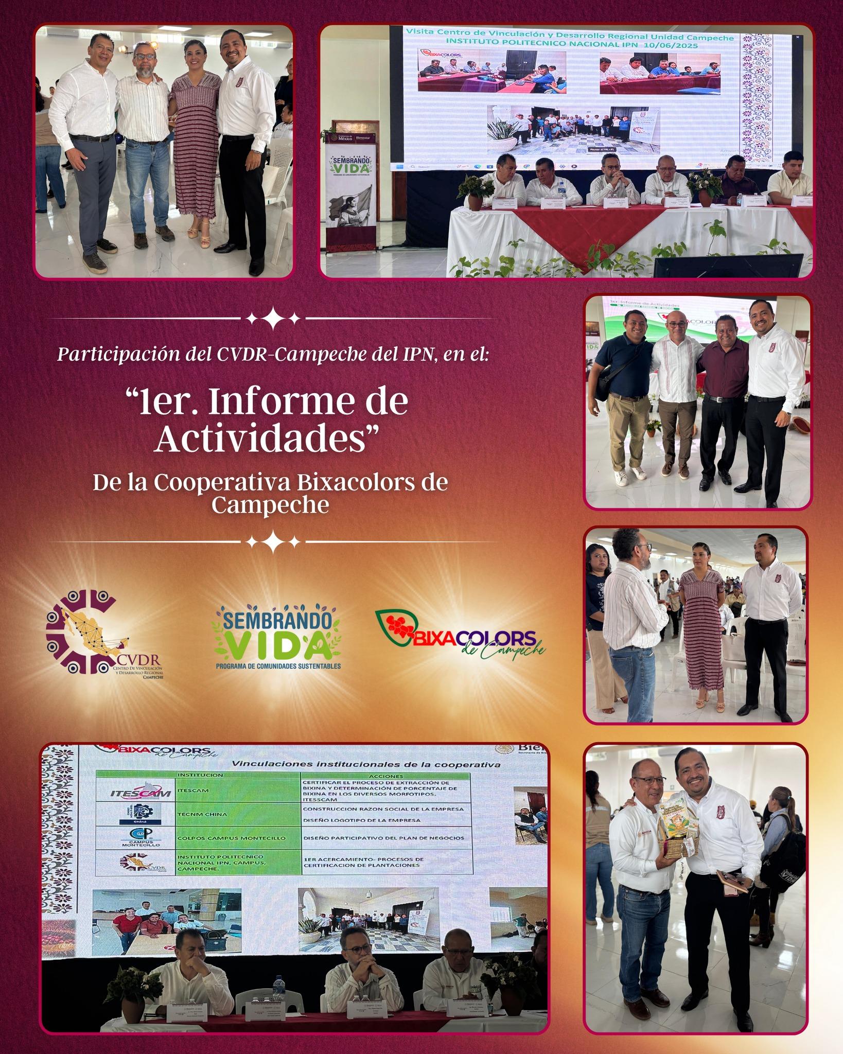 El 29 de octubre de 2025, el Mtro. Guillermo Aid Jiménez Falcón, Director del CVDR Campeche del IPN, tuvo el honor de asistir, como invitado especial, al 1er. Informe Anual de Actividades de la Sociedad Cooperativa BIXACOLORS de Campeche, como parte de las acciones de seguimiento de la colaboración entre ambas partes. Al evento también asistió personal de la Subsecretaría de Inclusión Productiva y Desarrollo Rural de la Secretaría del Bienestar, con quienes se tuvo la oportunidad de intercambiar ideas respecto a la innovación en el sector agroindustrial y el fortalecimiento de la cadena de valor del achiote en nuestra región.